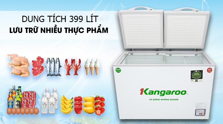 Tủ đông kháng khuẩn Kangaroo KG399IC1 thiết kế 1 ngăn 2 cánh mở rộng rãi. Dung tích tổng 399l tăng khả năng lưu trữ thực phẩm. Kết hợp giỏ đựng giúp dễ dàng phân loại thực phẩm tươi sống, thực phẩm chín, thực phẩm chế biến sẵn… hạn chế nguy cơ nhiễm khuẩn. Kính trượt cường lực cho phép quan sát thực phẩm bên trong trước khi mở, chống thoát nhiệt, tiết kiệm điện năng và thực phẩm được bảo quản tươi ngon hơn.