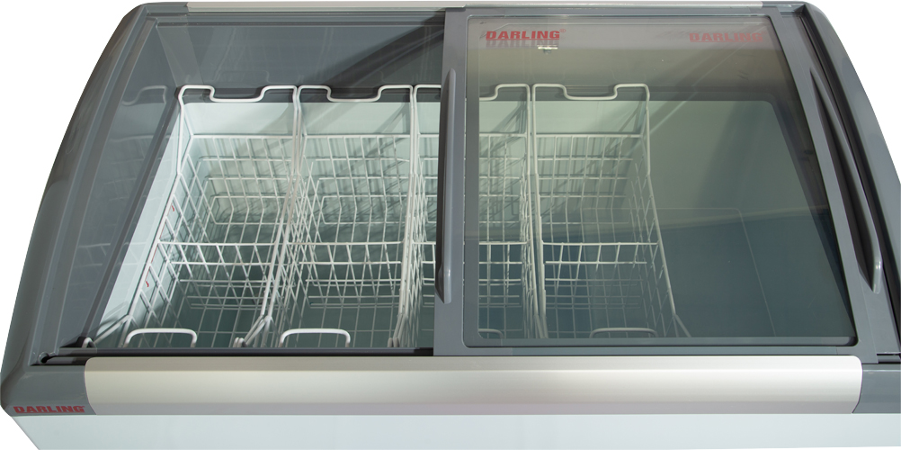 Tủ kem thiết kế kính cong nắp trượt. Có đèn Led chiếu sáng bên trong tủ. Phía bên trong tủ có rổ đựng phía trong tủ thuận lợi cho việc phân loại thực phẩm. Phía bên trong tủ có 4 giỏ đựng đồ giúp phân loại nhiều loại thực phẩm.