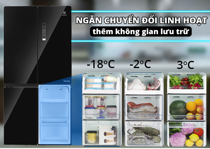 Tủ lạnh Electrolux trang bị Ngăn đa năng FlexFresh cho phép bạn điều chỉnh linh hoạt từ -23°C đến +7°C theo nhu cầu lưu trữ thực phẩm đa dạng