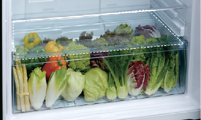 Tủ lạnh Inverter với ngăn chứa rau quả rộng rãi, hơi lạnh không thổi trực tiếp vào bên trong giúp duy trì độ ẩm tối ưu. Các loại rau, quả sẽ luôn được giư ẩm ở nhiệt độ tối ưu giúp dự trữ tươi ngon trong thời gian dài hơn. Bên cạnh đó, tủ lạnh còn được trang bị hệ thống khay kính chịu lực đảm bảo an toàn tuyệt đối trong quá trình bảo quản thực phẩm, không xảy ra hiện tượng nứt vỡ.