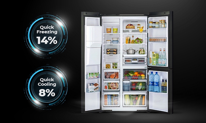 Khi muốn làm đá nhanh hơn, bạn hãy Bật chế độ Quick Freezing để làm đá nhanh hơn 14%. Khi muốn làm mát thực phẩm nhanh chóng, hãy BẬT chế độ Quick Cooling. Chế độ này giúp làm lạnh nhanh hơn khoảng 8%.