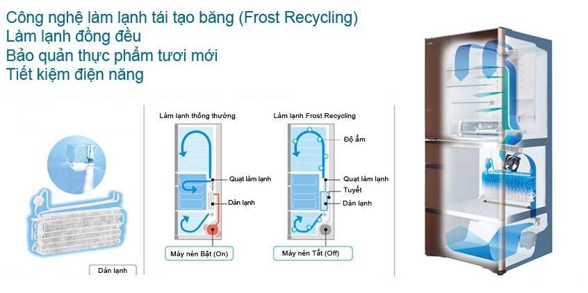 - Công nghệ làm lạnh tái tạo băng Frost Recycling: với tính năng làm lạnh tái tạo băng (Frost Recycling), không khí lạnh được tạo ra nhờ băng hình