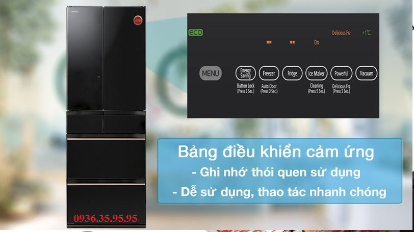 - Tủ lạnh Hitachi Multi Door HW540RV(XK) được thiết kế bảng điều khiển cảm ứng bên ngoài cửa tủ, có thể ẩn nếu chưa đánh thức, góp phần tinh tế cho dòng tủ lạnh Hitachi cao cấp. Ở trạng thái bình thường, bảng điều khiển cảm ứng của tủ lạnh sẽ được ẩn đi. Khi chạm vào nút MENU, Bảng Điều Khiển sẽ xuất hiện trên cửa tủ, giúp bạn điều chỉnh cài đặt dễ dàng mà không cần phải mở cửa. Bảng Điều Khiển sẽ tắt khi không sử dụng. Tuy nhiên, những cấu hình sẽ được hiển thị khi bật gồm: đèn Eco, đèn báo cấp nước, cửa mở/đóng (khi mở/đóng cửa thường xuyên), tiết kiệm điện năng, làm đá nhanh, dừng làm đá, làm lạnh nhanh và cấp đông nhanh.
