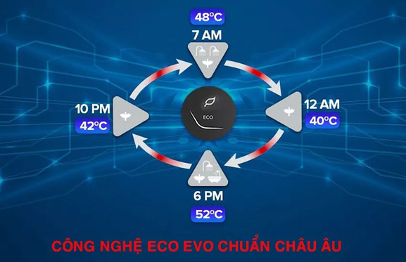 Công nghệ ECO EVO chuẩn châu Âu, có khả năng ghi nhớ thói quen sử dụng, tự động tính toán lượng nước nóng & nhiệt độ phù hợp nhất, giúp tiết kiệm điện tới 14%, và đạt chuẩn 5 sao tiết kiệm năng lượng.