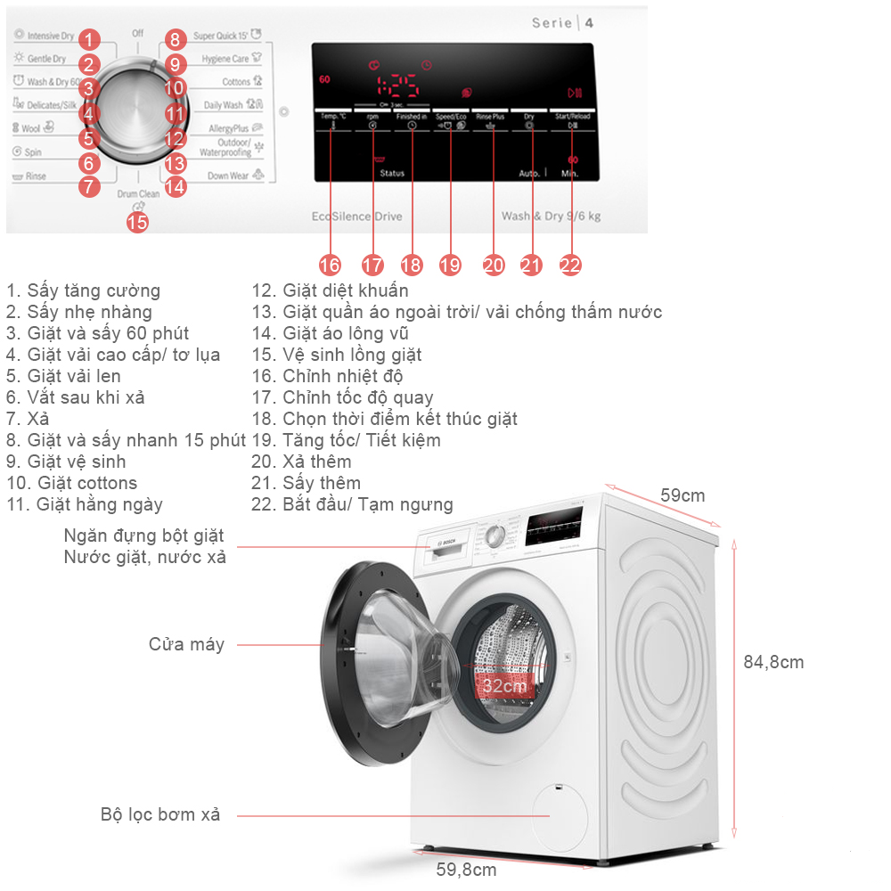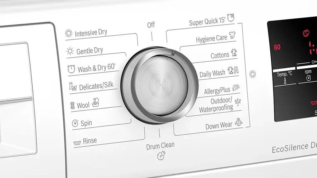 Cụ thể các chương trình được tích hợp bao gồm: giặt và sấy khô nhanh trong 15 phút (Super Quick 15'), giặt vệ sinh (Hygiene Care), giặt tiêu chuẩn (Cottons), giặt hàng ngày (Daily Wash), giặt diệt khuẩn Allergy Plus (Allergy Plus), giặt và sấy trong 60 phút (Wash&Dry 60'), giặt quần áo ngoài trời/Vải chống thấm nước (Outdoor/Waterproofing), giặt áo lông vũ (Down Wear), Vệ sinh lồng giặt (Drum Clean), Xả (Rinse), Vắt sau khi xả (Spin), Vải cao cấp/tơ lụa (Delicates/Silk), giặt vải len (Wool), sấy tăng cường (Intensive Dry), sấy nhẹ nhàng (Gentle Dry).
