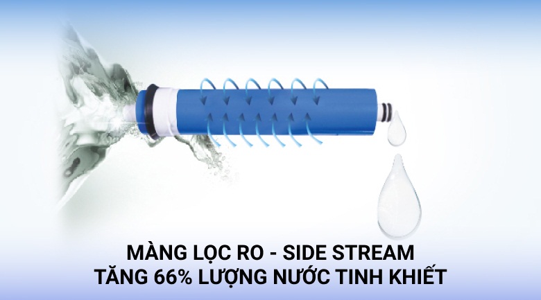 Cùng với đó, công nghệ màng lọc RO – Side Stream còn đảm bảo hiệu suất sử dụng cao với tỷ lệ nước thải : nước tinh khiết là 1:1; giúp tăng 66% lượng nước tinh khiết, giảm 56% lượng nước thải, cho khả năng tiết kiệm nước tối đa. Bên cạnh đó còn kéo dài tuổi thọ lõi lọc gấp 1.5 lần so với màng lọc RO thường.