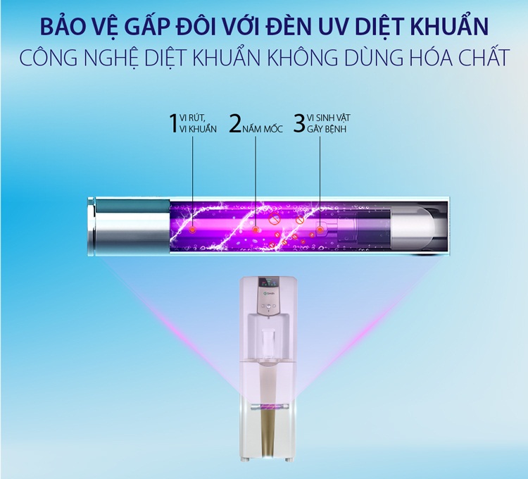 Công nghệ diệt khuẩn UV trong bình chứa chống tái nhiễm khuẩn, loại bỏ vi khuẩn, nấm mốc, vi sinh vật gây bệnh, giữ cho nguồn nước đầu ra luôn tinh khiết, sạch sẽ, an toàn với sức khỏe người dùng.
